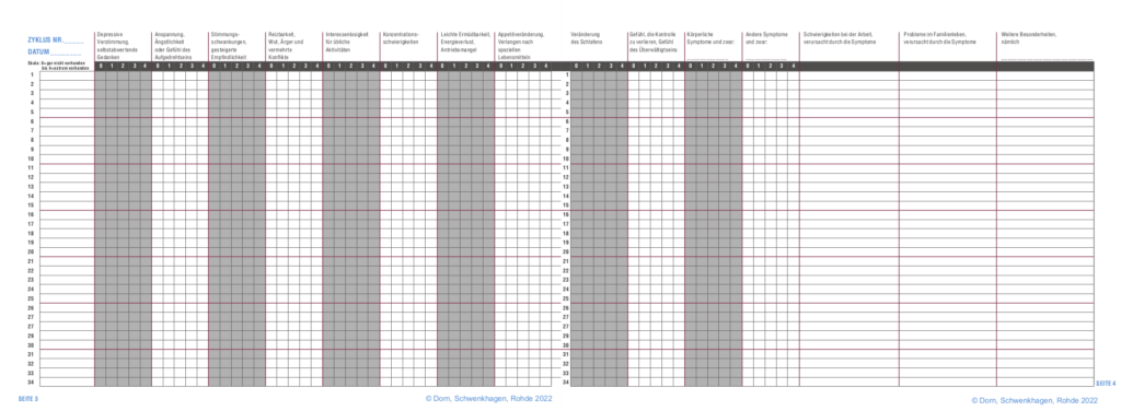 Dieses Zyklustagebuch haben wir vor vielen Jahren entwickelt, und zwar auf der Basis der Kriterien, mit denen auch die Diagnose gestellt wird. Der Einsatz dieses Zyklustagebuches hat sich mittlerweile bei vielen hunderten Patientinnen bewährt.